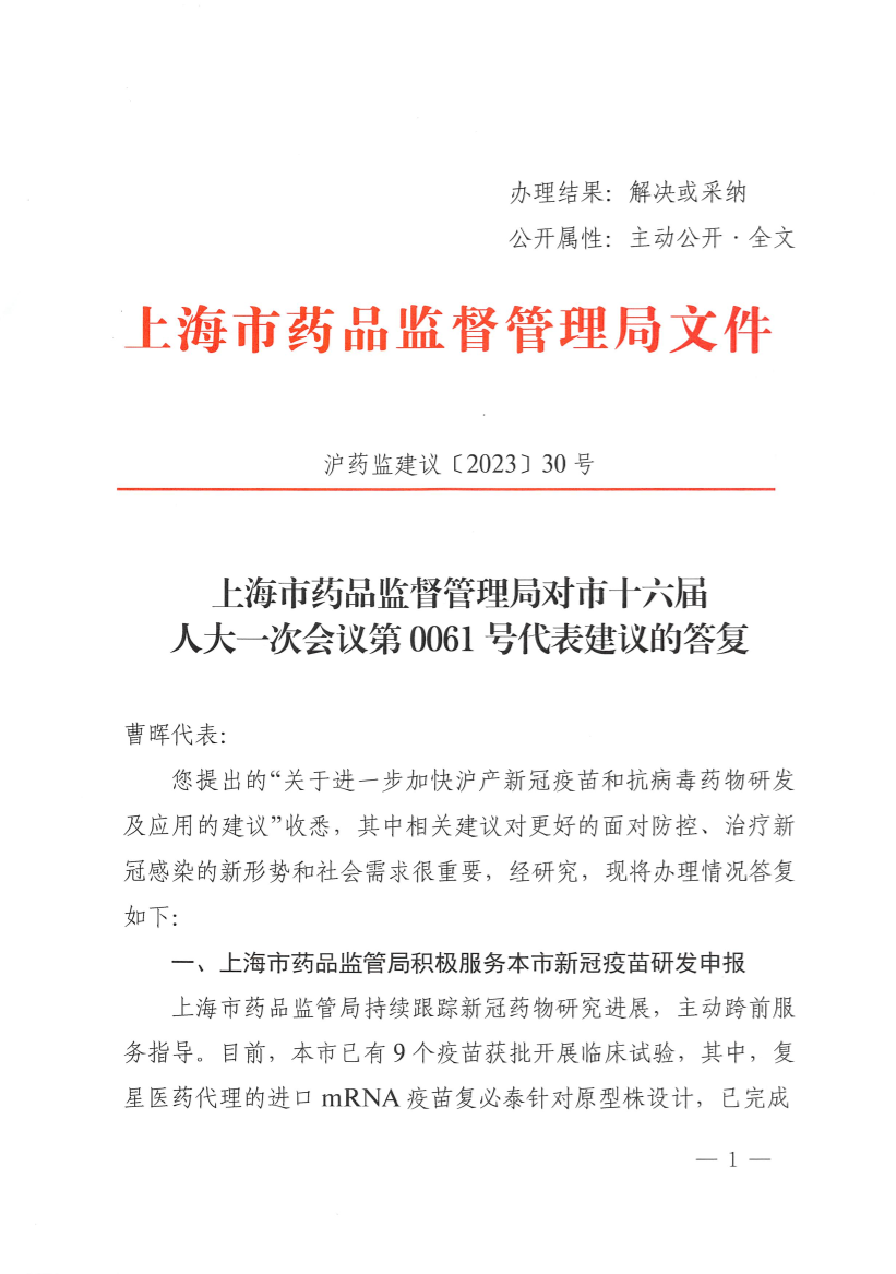 非常感谢您对沪产新冠疫苗和抗病毒药物研发及应用的关心,也感谢对药品监管工作的关心和支持。