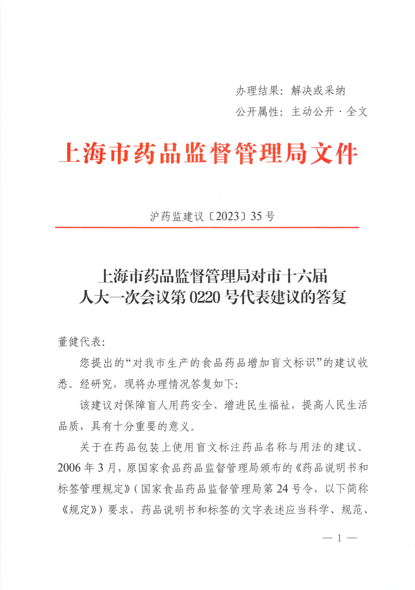 您提出的“对我市生产的食品药品增加盲文标识”的建议收悉。经研究,现将办理情况答复如下: