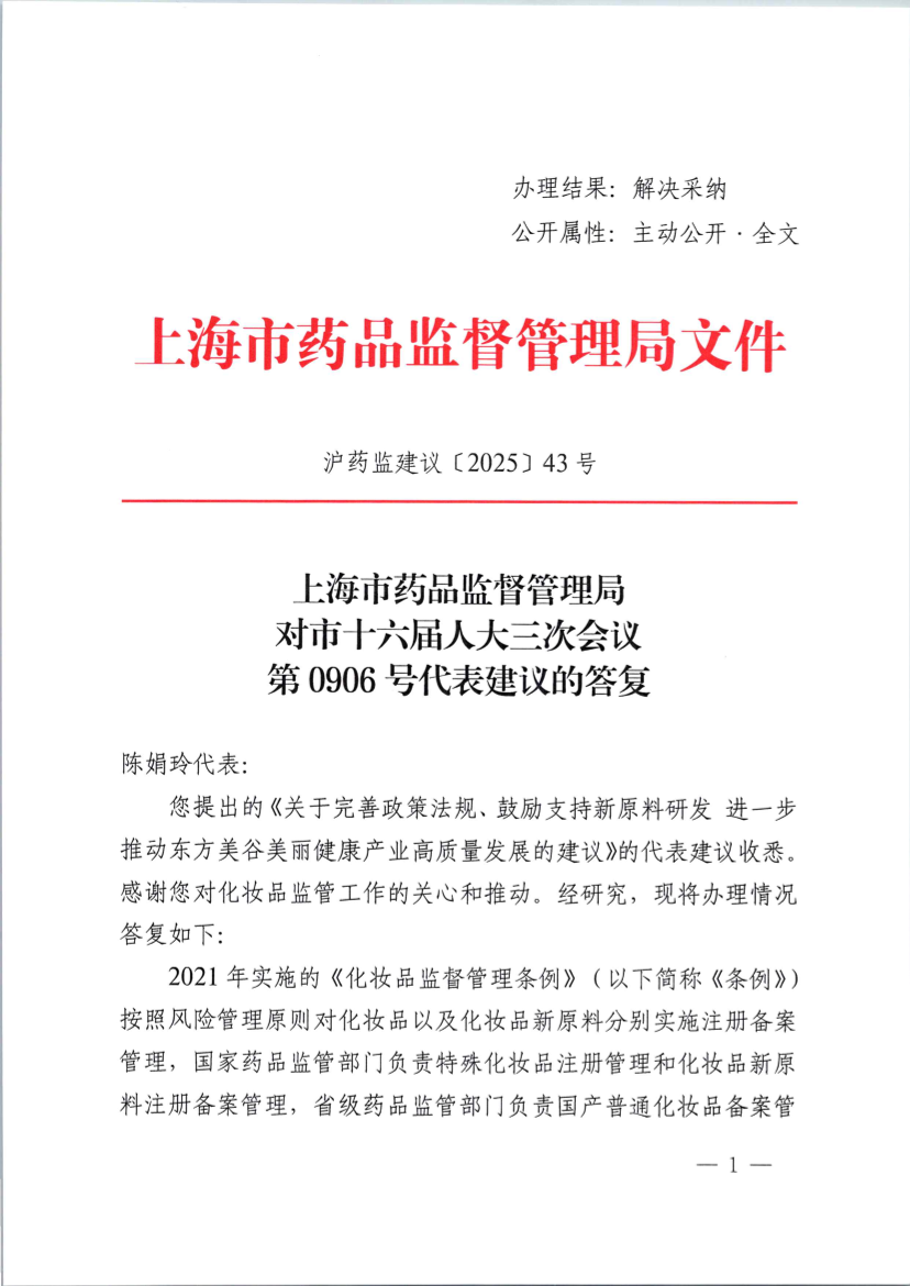 您提出的《关于完善政策法规、鼓励支持新原料研发 进一步推动东方美谷美丽健康产业高质量发展的建议》的代表建议收悉。感谢您对化妆品监管工作的关心和推动。经研究,现将办理情况答复如下: