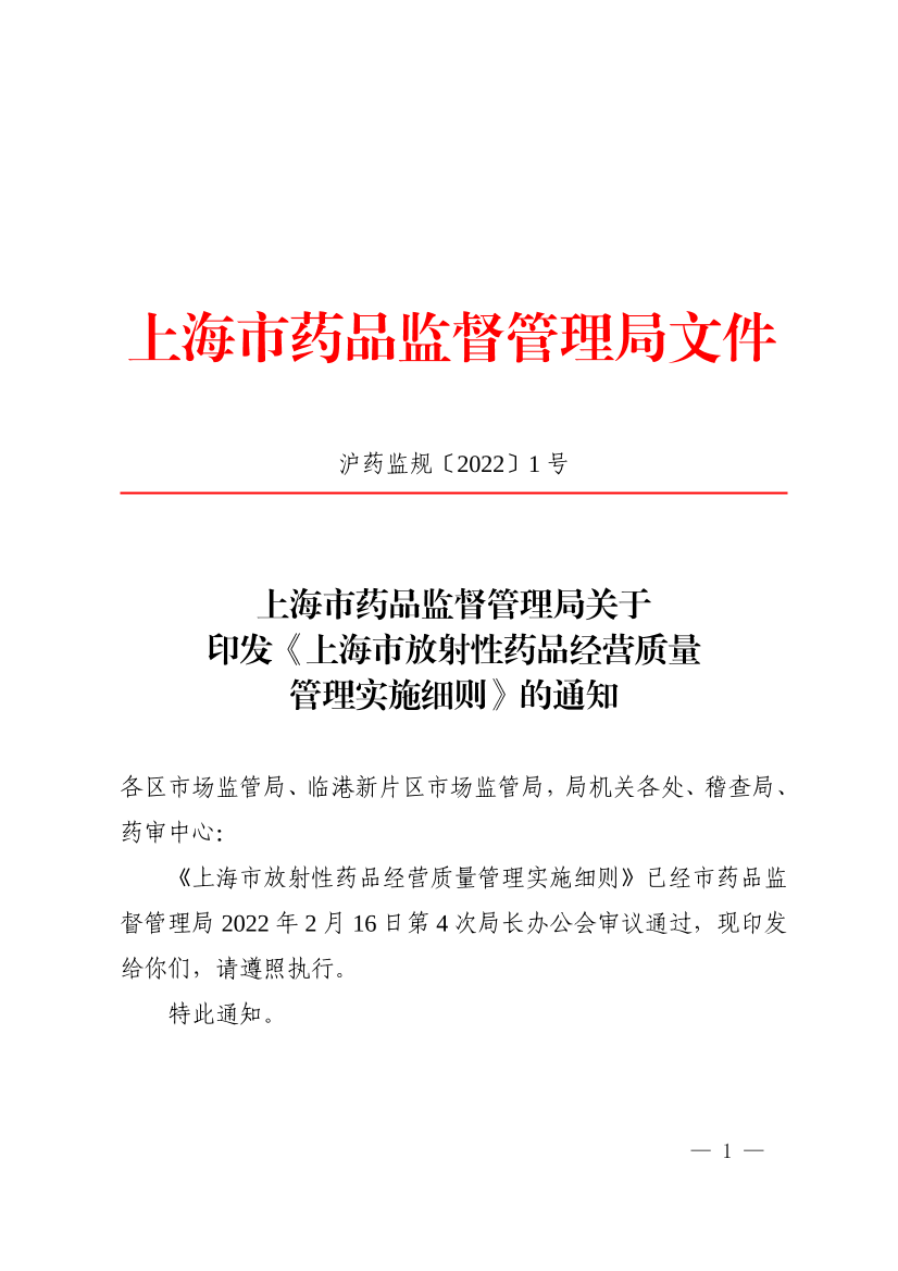 (有效期至2027年5月7日)AG真人关于印发《上海市放射性药品经营质量管理实施细则》的通知