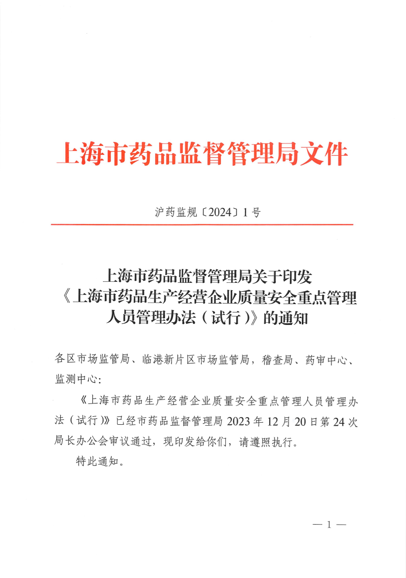 《上海市药品生产经营企业质量安全重点管理人员管理办法(试行)》已经市药品监督管理局2023年12月20日第24次局长办公会审议通过,现印发给你们,请遵照执行。