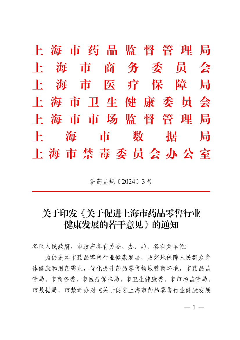 为促进本市药品零售行业健康发展,更好地保障人民群众身体健康和用药需求,优化提升药品零售领域营商环境,市药品监管局、市商务委、市医疗保障局、市卫生健康委、市市场监管局、市数据局、市禁毒办对《关于促进上海市药品零售行业健康发展的若干意见》进行了修订,经市政府同意,现印发给你们,请认真贯彻执行。