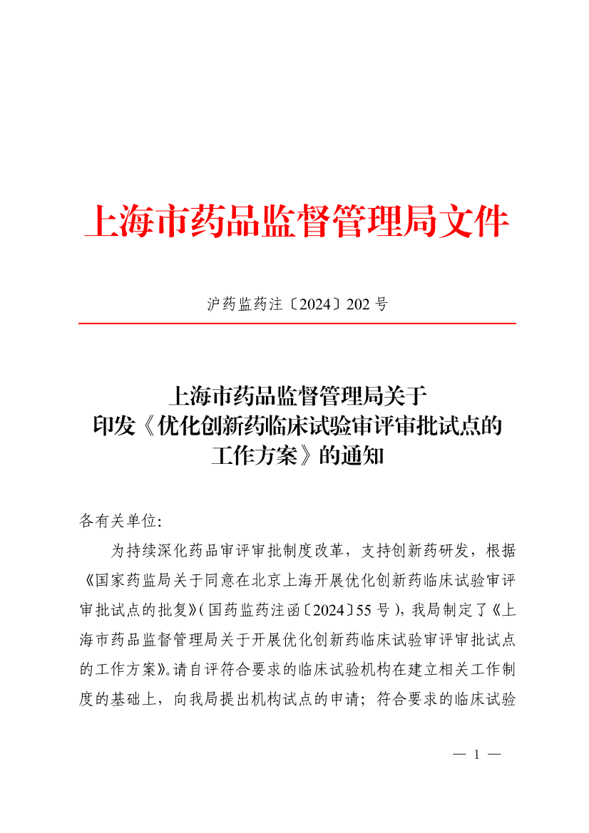 为深入学习贯彻席大大总书记考察上海重要讲话精神,进一步贯彻落实中共中央、国务院关于支持上海建设“五个中心”的意见,对标国际规则规范实施临床试验项目、缩短临床试验启动整体用时等多项改革任务,根据《AG真人关于同意在北京上海开展优化创新药临床试验审评审批试点的批复》(国药监药注函〔2024〕55号),本市已获批同意开展优化创新药临床试验审评审批试点。为做好相关试点工作,制订本方案。