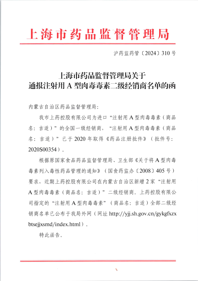根据原国家食品药品监督管理局、卫生部《关于将A型肉毒毒素列入毒性药品管理的通知》(国食药监办〔2008〕405号)要求,近期上药控股有限公司在内蒙古自治区新增2家“注射用A型肉毒毒素(商品名:吉适)”二级经销商。上药控股有限公司指定的“注射用A型肉毒毒素”(商品名:吉适)全部二级经销商名单已公布于我局外网(网址https://www.askai.vip/gykgfxzxbtsejjxsmd/index.html)。